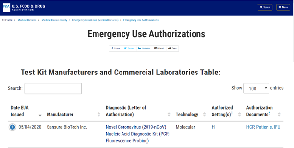 北京时间5月5日晚,金年会jinnian金字招牌诚信至上生物新型冠状病毒核酸检测试剂盒获美国食品药品监督管理局(FDA)紧急使用授权(EUA, Emergency Use Authorizations),这是该产品继1月28日获得中国国家药监局(NMPA)注册认证、3月3日获得欧盟CE认证后,金年会jinnian金字招牌诚信至上生物获得的又一重要认证,将进一步助力公司服务全球新冠肺炎疫情防控。